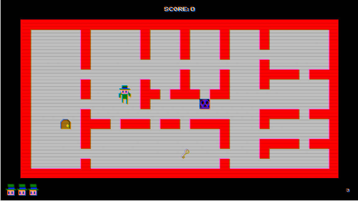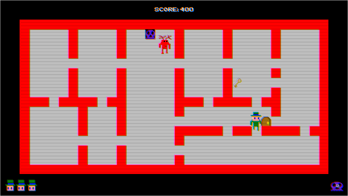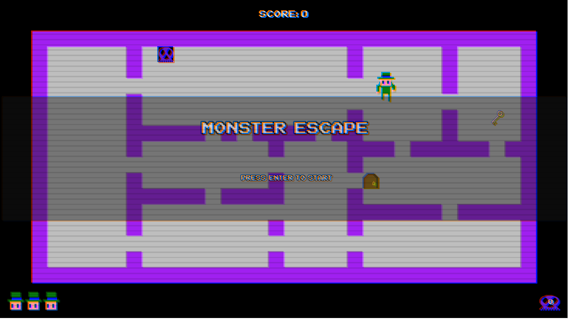 Atari 1200-style arcade game. The goal is to collect the key and reach the exit without getting caught by the monster. All levels are procedurally generated and have no ending. The real end is when the game is over. You have a high score; let's see what your highest score is.